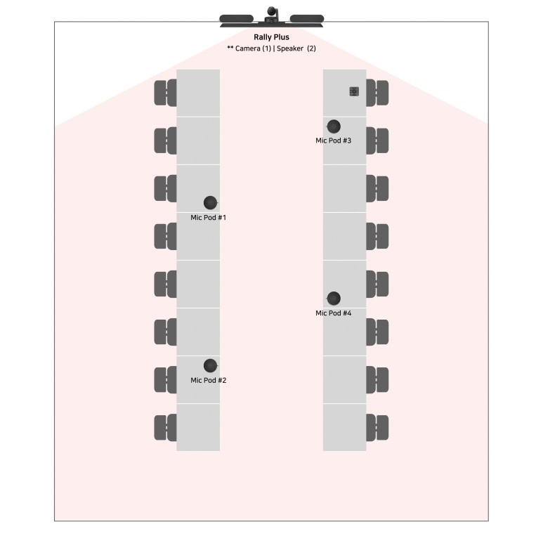 공간이 넓고 회의 참가자가 많기 때문에 집중을 위한 고배율 카메라 (방향과 확대/축소를 원격 및 빠른 속도로 제어할 수 있고 프리셋을 지원하는 최상급 카메라)와 참가 인원에 맞게 원활하게 수음 범위를 확보할 수 있고 유연하게 배치할 수 있는 모듈형 음향 시스템 (마이크/스피커 분리형)